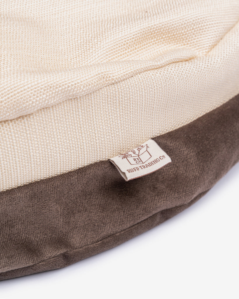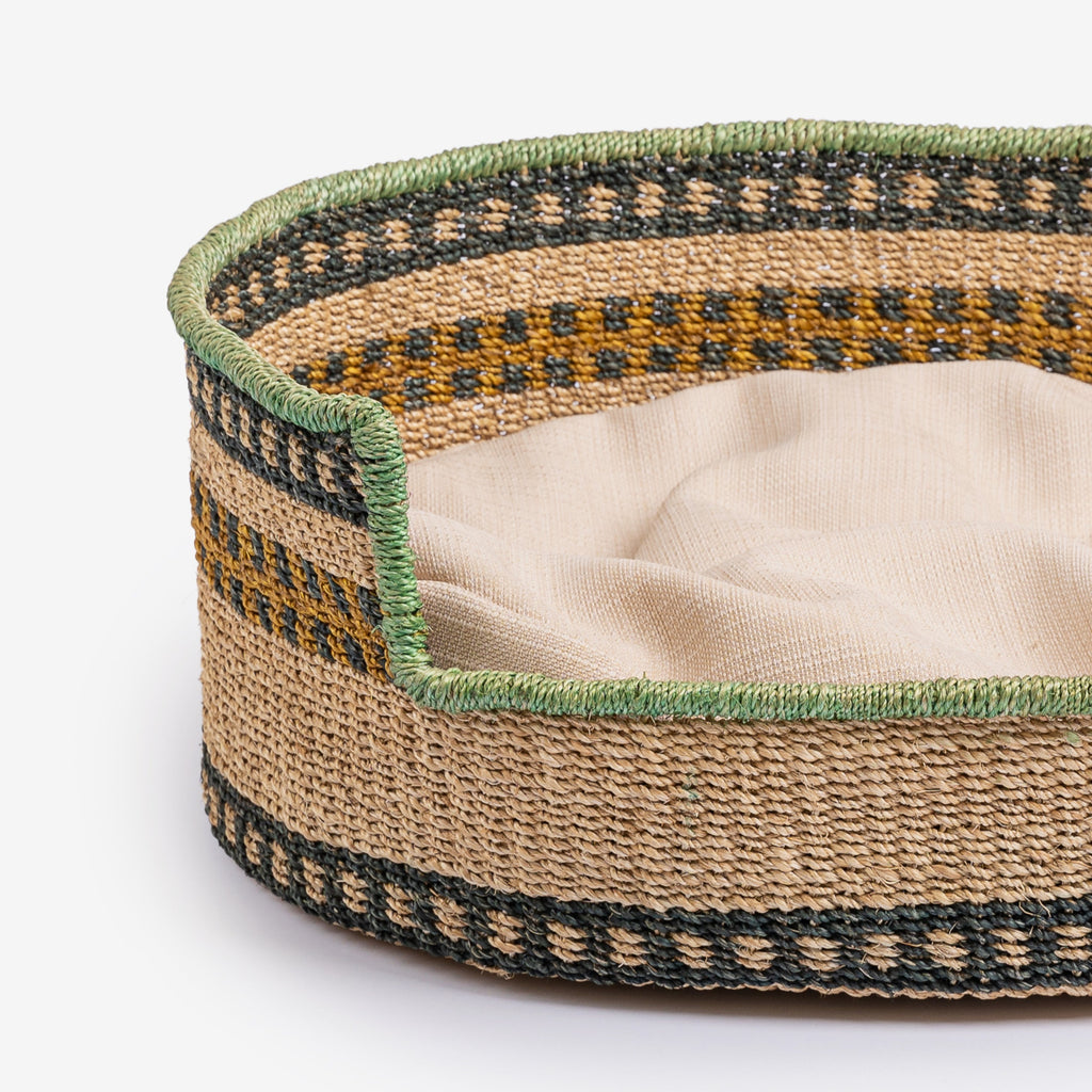 100% hand-woven Abaca pet bed with two-toned machine washable pillow: flip to the fuzzy brown side when coming home from a dirty walk outside!