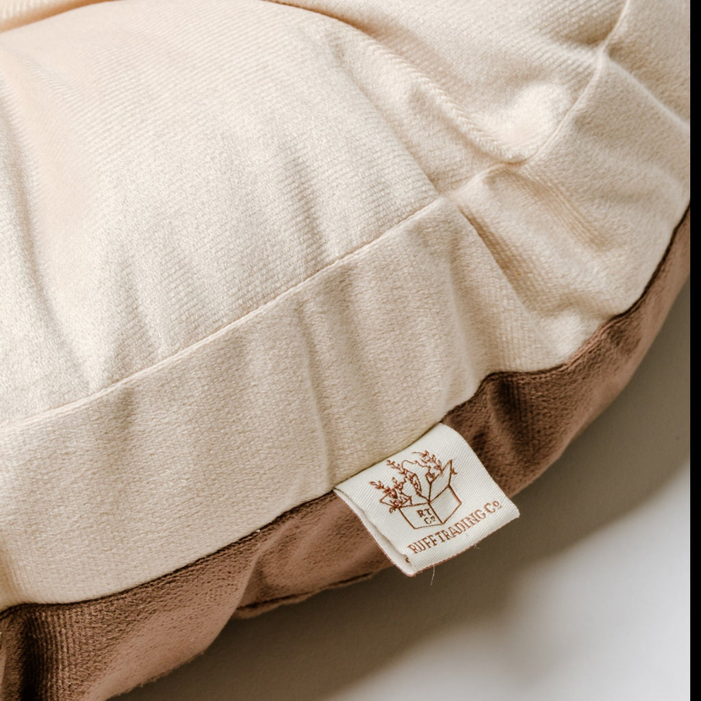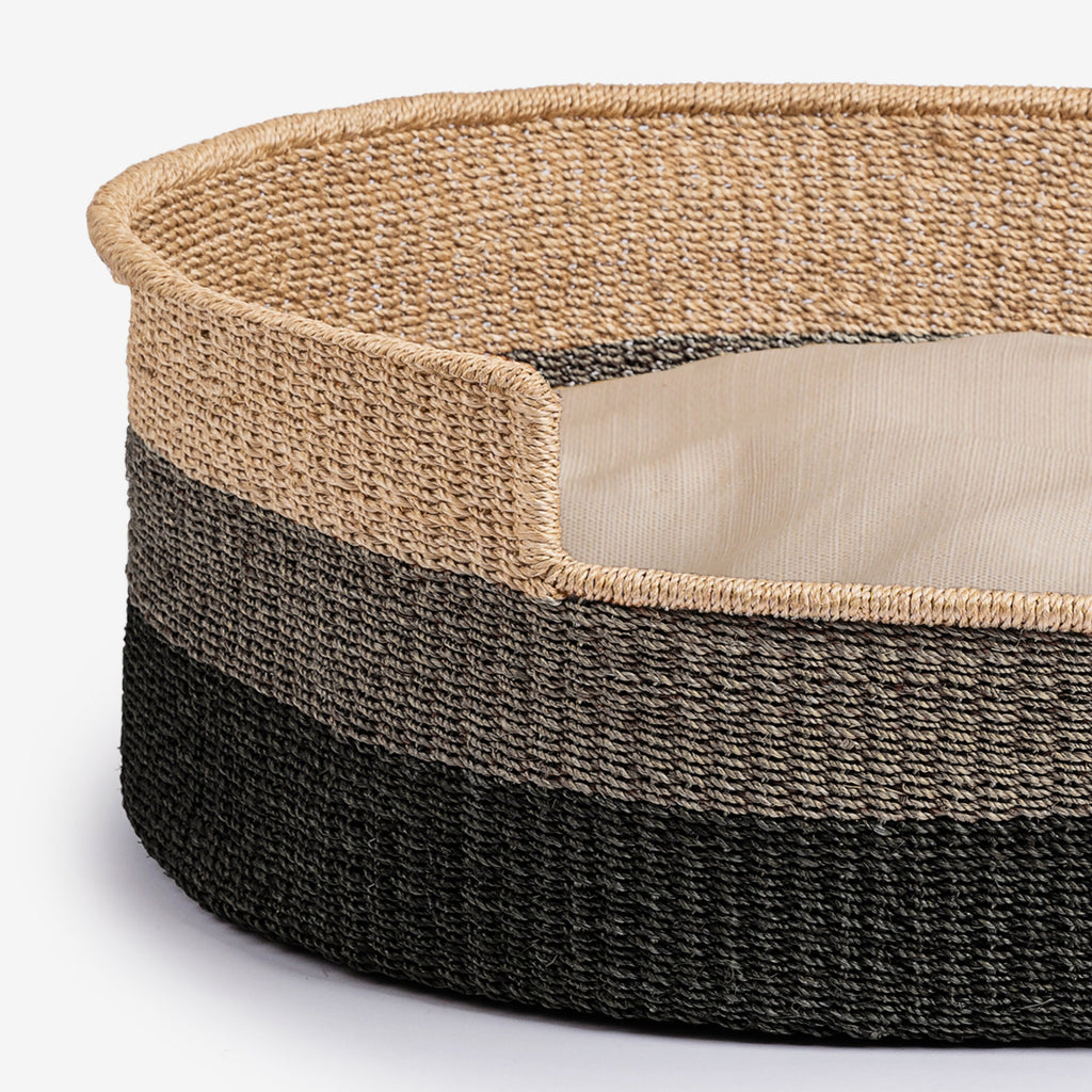 100% hand-woven Abaca pet bed with two-toned machine washable pillow: flip to the fuzzy brown side when coming home from a dirty walk outside!